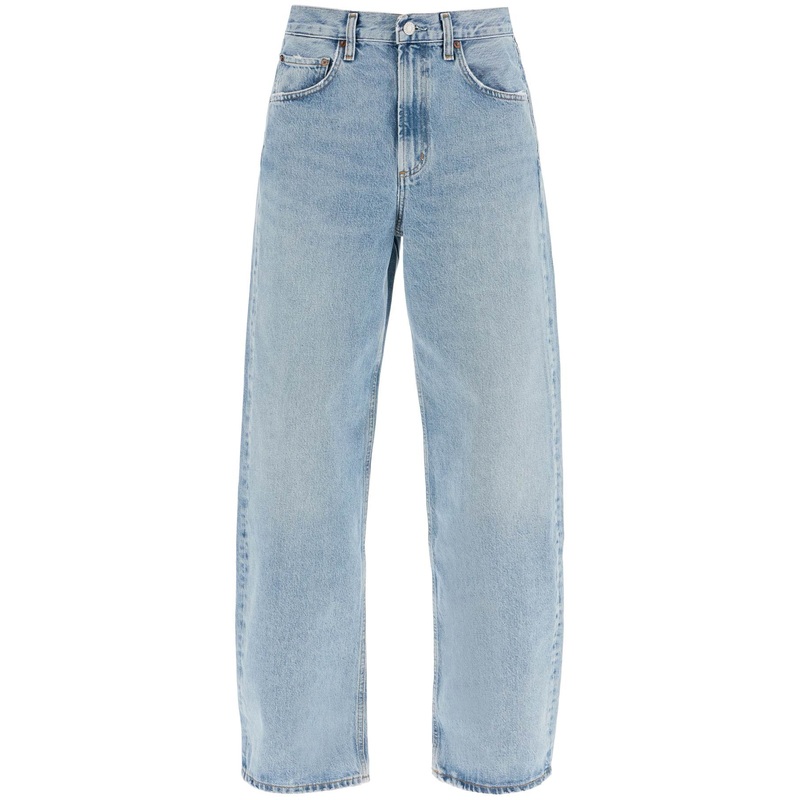Agolde jeans made from soft cotton sourced from regenerative agriculture, featuring a dark vintage wash and a relaxed fit with a curved leg and low rise. They have a hidden zip closure with a branded button and belt loops at the waist. The model is 177 cm