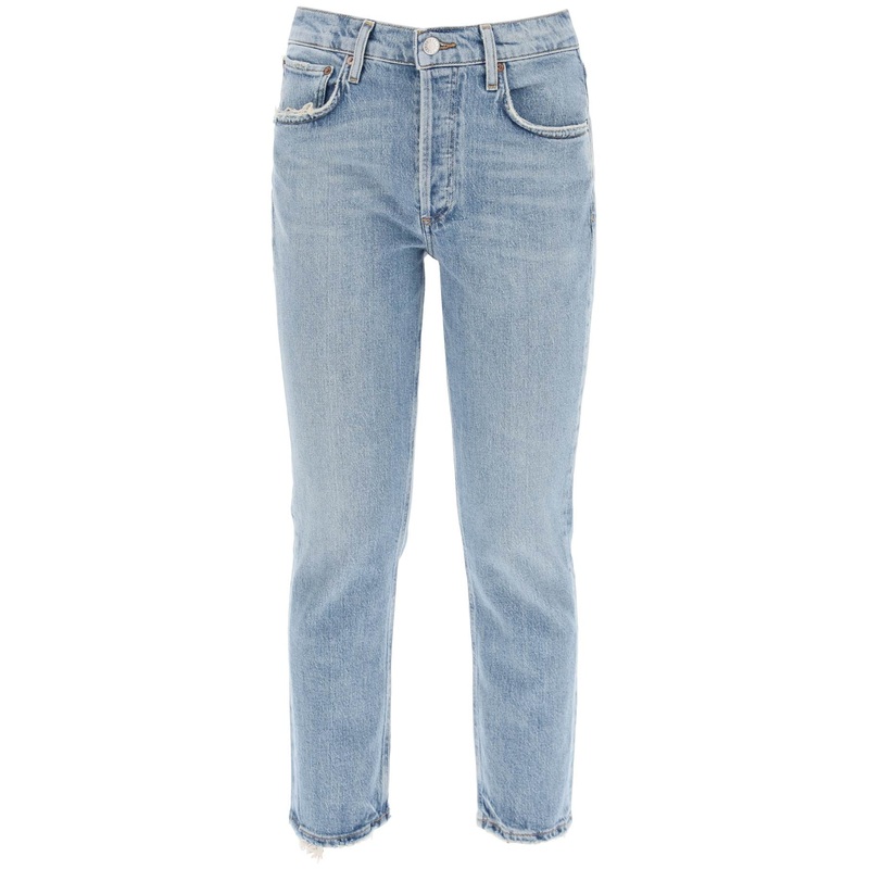 The Agolde Riley jeans are made of a stretch blend of recycled cotton denim, featuring a light vintage wash and a five-pocket design with a high-waisted straight cropped cut. They have hidden logo buttons for closure and belt loops at the waist. Finished w