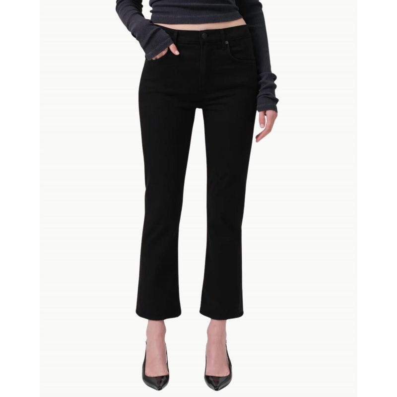 The trend report says boot-cut is in and that’s exactly why we love this style. They are fit to perfection, flattering on any body type, and comfortable. They will be your go-to all season long.Upgrade your wardrobe with the Isola Cropped Boot by Citizens of Humanity, a chic addition in plush black that seamlessly fits a clean and polished look. These mid-rise jeans, crafted from an 88% cotton, 10% polyester, and 2% spandex blend, offer a flattering close fit through the leg with a subtle bootcut flare. The cropped length hits right above the ankle, perfect for showcasing your favorite shoes. Designed for comfort and style, this pair features a convenient zip fly closure and maintains its shape wear after wear. Dimensions – Rise 11 1/4″, Inseam 26 1/2″, Leg Opening 16 1/2″. Model is 5’10” and is wearing a size 27.