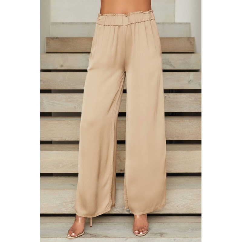 Features a high, elasticized ruffle waistband with delicate stitching details and subtle pleating for added flow. The wide-leg silhouette creates an elegant, relaxed fit, while the silky fabric drapes beautifully, offering a sophisticated yet comfortable look.