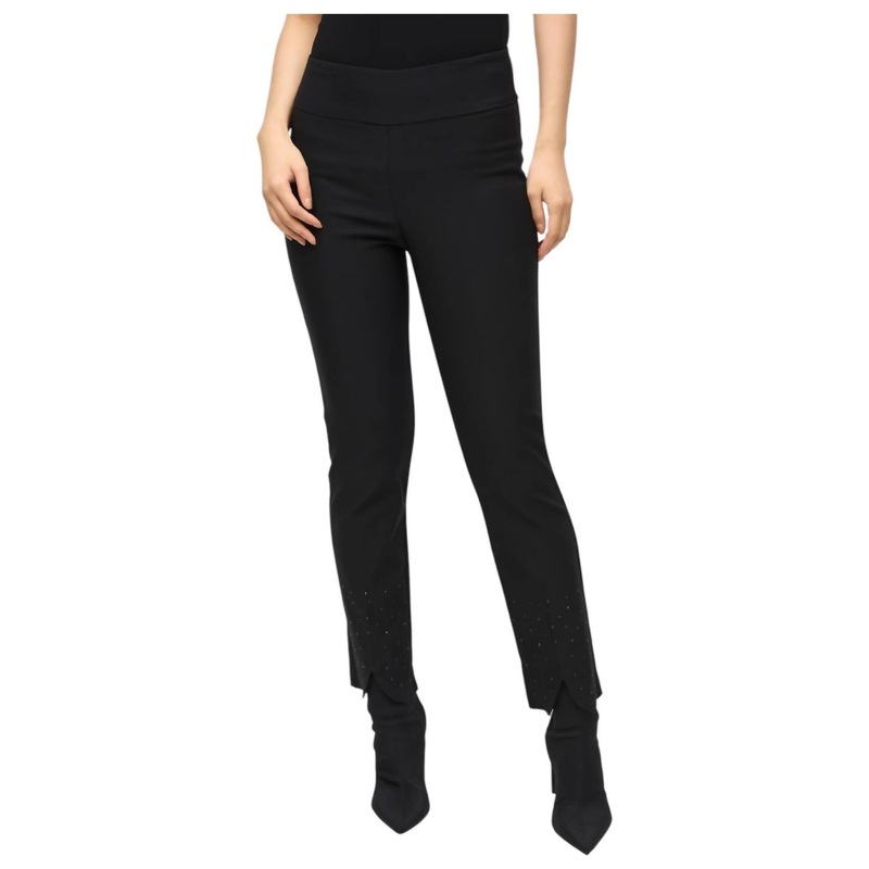 Introducing the Jeweled Slit Trousers by Joseph Ribkoff, an embodiment of chic sophistication in black. These full-length trousers, crafted from a luxurious viscose blend, feature a sleek solid pattern with dazzling jewel adornments for an opulent touch. W