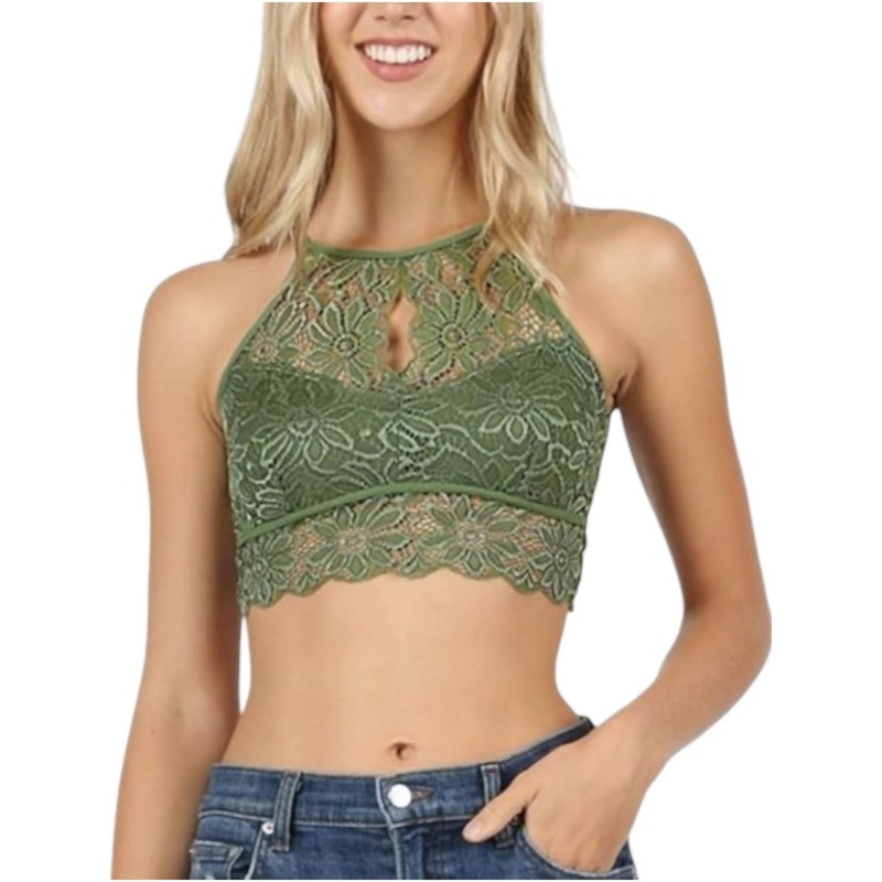 Keyhole high neck design. Lace bralette with lined cups for added coverage. Racerback style with keyhole cutout.