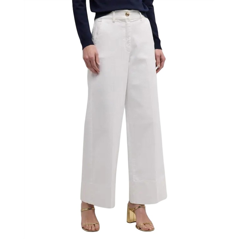Marella “Lava” pants with metallic logo button. High rise sits high on the hips. Flat front. Side slant pockets. Back patch pockets. Full length. Straight legs. Button/zip fly; belt loops. Dry clean. 98% cotton & 2% elastane.