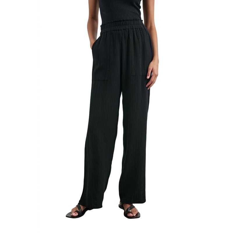 Made with super soft, breezy double gauze cotton in an easy pullover silhouette, these pants are perfect for any occasion. These straight leg pants feature flattering side slits at the outer leg opening and a smocked waistband for added comfort. 100% Cotton.