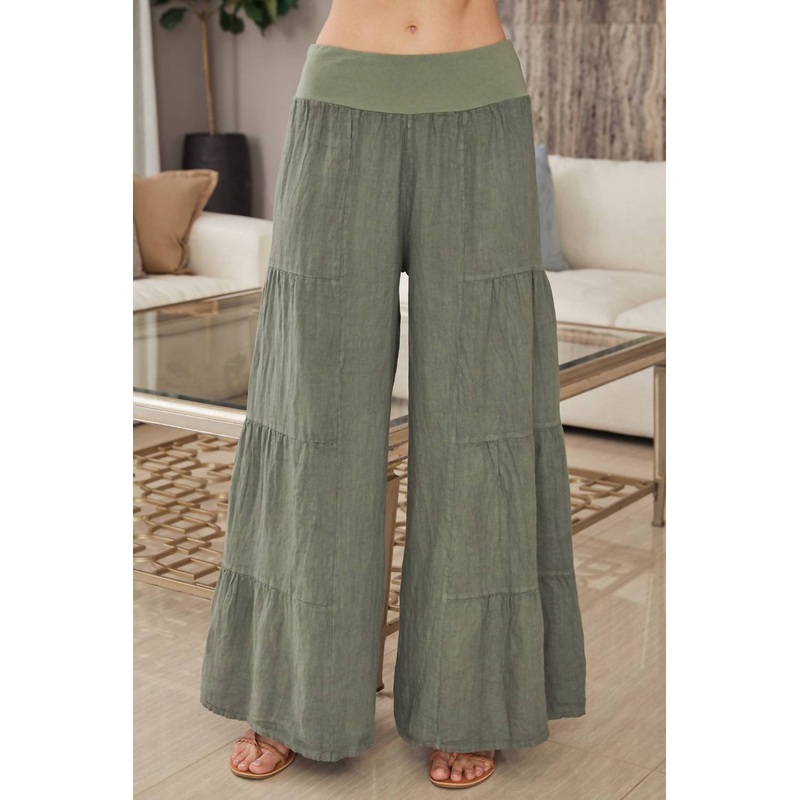 Elevate your outfit with the Linen Tiered Palazzo Pants by Milio Milano, a sophisticated choice for any occasion. These wide-leg pants come in a textured grey and are crafted from 100% linen, ensuring breathability and style. Designed with a high-rise and
