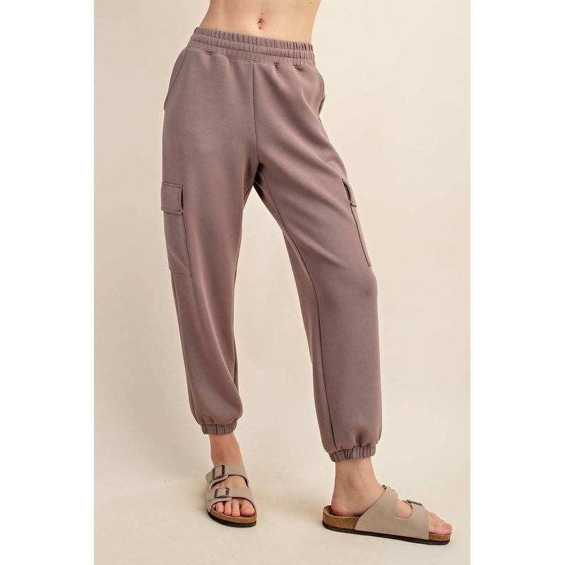 Experience the perfect blend of fashion and comfort with the Lost in My Fairy Tale Scuba Cargo Joggers by RAE MODE, featured in a chic Mocha Cream shade. Crafted from 48% Modal, 45% Polyester, and 7% Spandex, these joggers boast a relaxed fit with a stylish tapered leg design. The cargo style offers functional front and side pockets, with a convenient pull-on closure enhanced by an adjustable elastic waistband. Whether for laid-back or active moments, these solid-pattern joggers are an activewear essential.