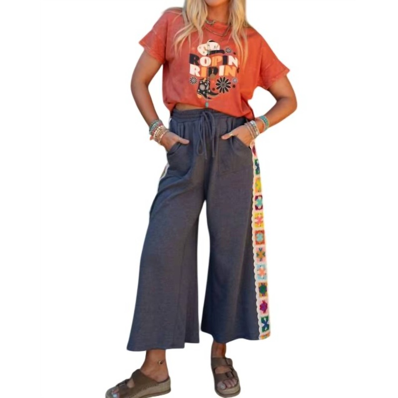 Features comfy sweatpant fabric.Relaxed and loose wide leg silhouette. High-rise elastic drawstring waist. Convenient front patch pockets. Cute crochet detail down the sides. Finished hem with raw edging along the bottom. Made in Mexico.
