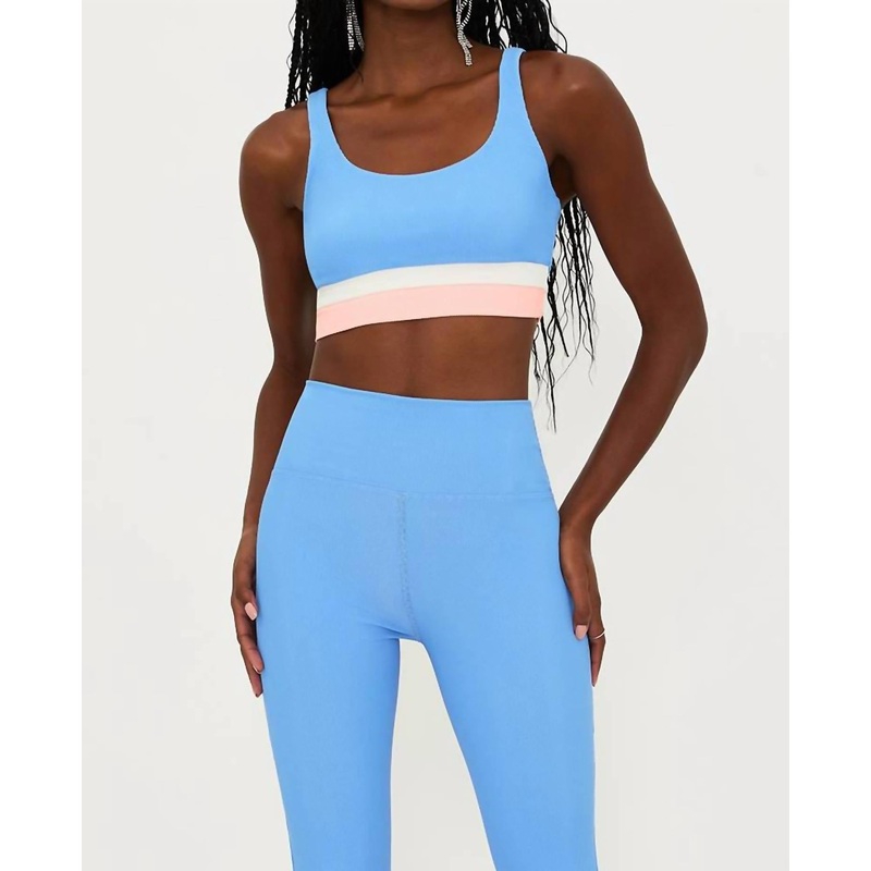 Essential for active women seeking style and comfort. Ribbed sports bra features a scoop neck and fixed straps. Offering medium support for swim and athletic endeavors. Crafted from 82% polyester and 18% spandex. Provides a textured feel in a vibrant blue hue. Brings lightweight convenience.