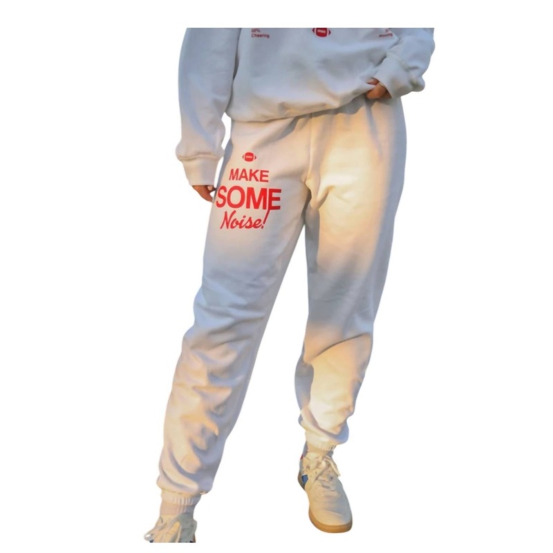 Pair these with your favorite sneakers for an effortlessly cool look.Introducing the Make Some Noise Sweatpants by Charlie Southern, a relaxed fit perfect for cozy game days. These white joggers feature a bold red "Make Some Noise!" graphic on the upper ri