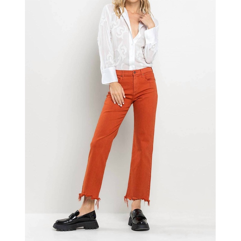 This straightleg pant is both stylish and comfortable. Did we mention the fit is perfection?Discover the Mango Frayed Hem Jean by Sneak Peek, a vibrant addition to your summer wardrobe. Crafted from a rich combination of 70% Cotton, 12% Polyester, 9% Rayon, and 2% Spandex, these jeans offer a comfortable fit with a stylish straight leg. In a striking orange hue, this denim features a trendy button closure and frayed hem detailing. Care instructions include line drying for lasting wear.