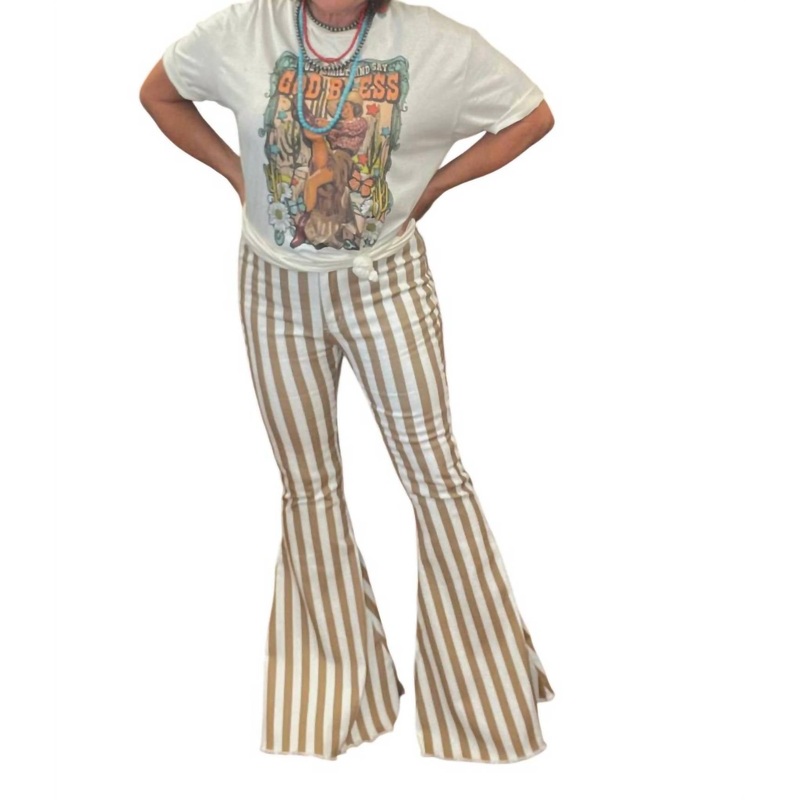 Introducing the Marbled Flare Pants by Peach Love, a statement piece that draws inspiration from a mix of concert and boho styles. These stripe-patterned tan flares feature a regular fit with a mid-rise waist and a unique unfinished hem for customizable lengths. Designed with a flared leg style that exudes both country and fun vibes, these pants are perfect for party-ready looks. Enjoy the convenience of pockets as well.