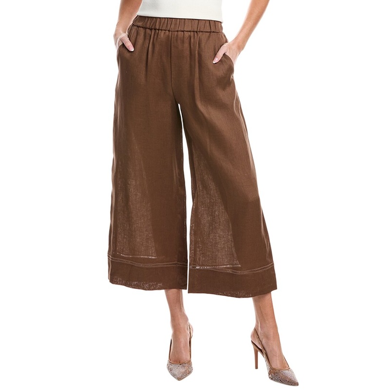 Introducing the Max Mara Leisure Brama Linen Trouser, a versatile addition to your casual wardrobe. Crafted from 100% linen, these trousers feature a relaxed fit with an elastic waist for comfort. The ladderstitch trim detail adds a touch of sophistication. Pair them with a simple top for an effortlessly chic look. Hand wash recommended. Imported. Available in brown color, with approximately 26 inches from shoulder to hem and inseam of approximately 13 inches. Model is 5’10 and wearing a size 4. Measurements may vary slightly by size.