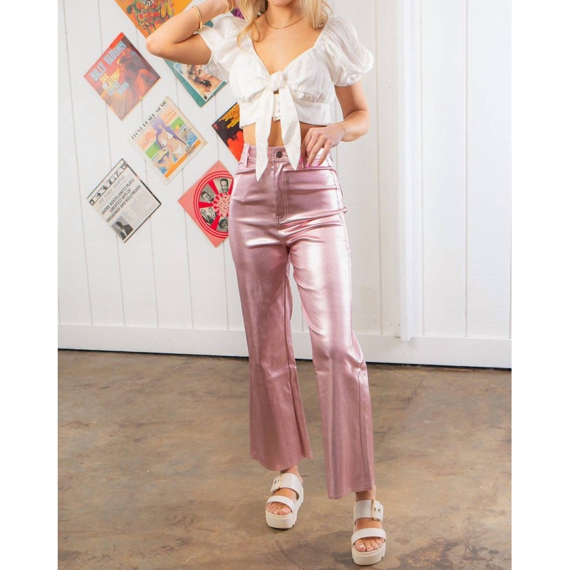 These high-waisted, wide-leg pants are crafted from luxurious vegan leather in a stunning metallic pink hue, perfect for creating an edgy vibe. Their cropped length and hidden zip fly with button closure add practicality and trendiness to this head-turning