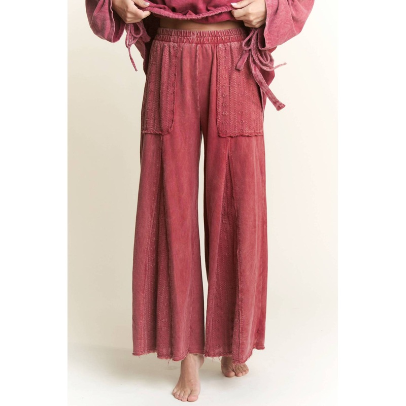 The Mineral Wash Flare Pant by J. Her offers a striking look in a rich burgundy hue, masterfully designed with an acid wash material. It features a convenient pull-on closure and flared leg style, bringing comfort with its elastic waist. Two floral-detailed pockets add a touch of feminine elegance to this solid-patterned design. Perfect for enhancing your wardrobe with unique flair, these pants are meant for women who appreciate both style and functionality. Harper, standing at 54 and weighing 126 lbs, wears a size small.