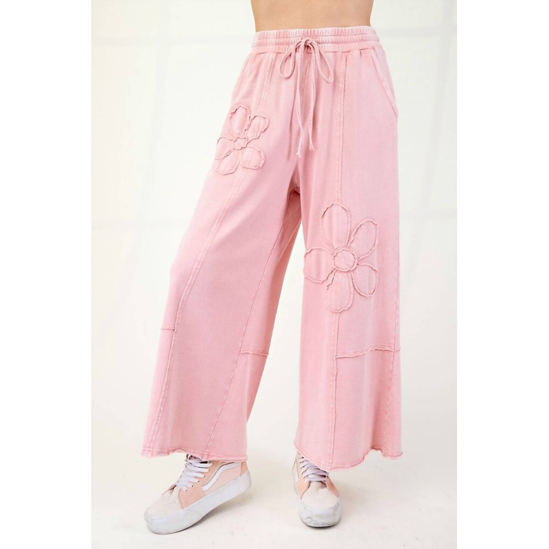 Get cozy with the Mineral Washed Terry Knit Pants With Flower Patches by Easel, showcasing a chic wide leg silhouette in a dried rose hue. These high-rise pants feature an elastic waistband with an adjustable drawstring for a relaxed and loose fit, complet
