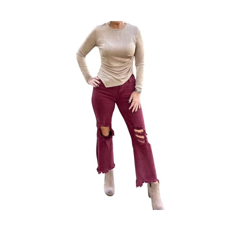 A perfectly tailored straight leg that you’ll want in every color!Presenting the My Angel For Life High Rise Straight Jeans by RISEN, a sleek addition in a rich wine color. Tailored from a comfortable blend of 98% Cotton and 2% Spandex, these jeans feature a high-rise waist with a knee-distressed and straight leg design. Closure – Button closure. For the perfect fit, consider sizing up as advised, with the rise measuring at 10 inches and an inseam of 27.5 inches. Model wears these in a height of 5’9″, waist 24″, and hips 35″.