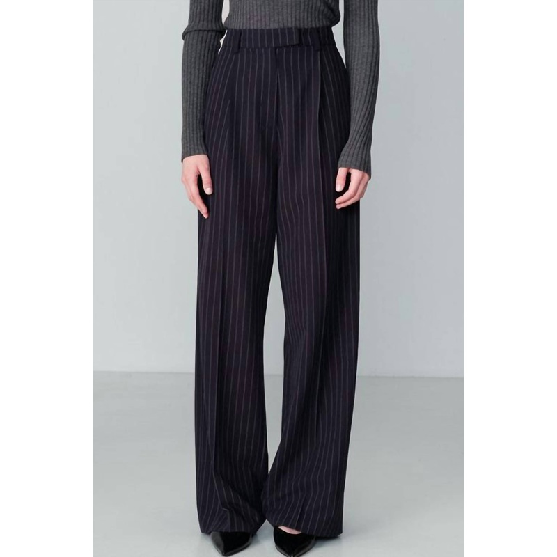 Meet the Neve Pinstripe Pants by Grace & Mila, a sophisticated choice for elevating your casual wardrobe. These navy wide-leg trousers boast Italian front pockets, a fake back pocket, and front pleats for a polished finish. The zip and hook closure ensure