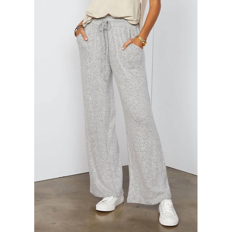 Experience ultimate comfort with the Norah Pants by Tart Collections, designed for relaxed lounging in a heather grey textured knit. These wide leg pants feature a soft sweater knit composition made from 95% Viscose and 5% Spandex, offering a mid-rise fit