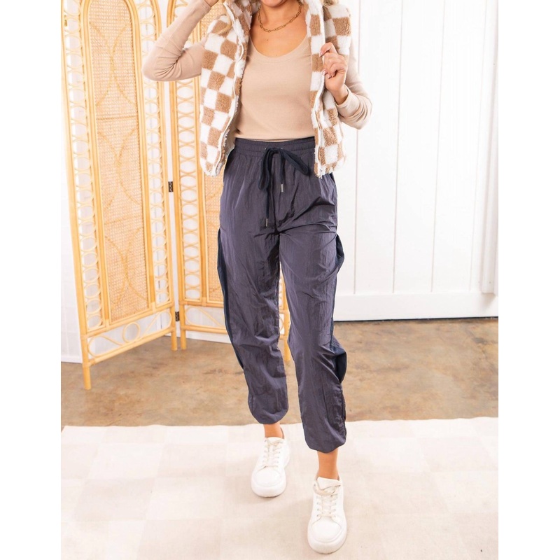 The perfect pant for running around town and looking cool while doing it.Elevate your activewear collection with the Number One Sporty Joggers by VERY J, featuring a trendy navy and charcoal color scheme. These windbreaker joggers are crafted with mesh paneling on the sides for enhanced breathability and style, and feature a mid-rise fit with an elastic tie waist for customized comfort. Their tapered leg and elastic ankle design add a sporty touch, making them perfect for a casual day out or an energetic workout. With practical pockets and solid patterning, these joggers promise versatility and convenience for any occasion.