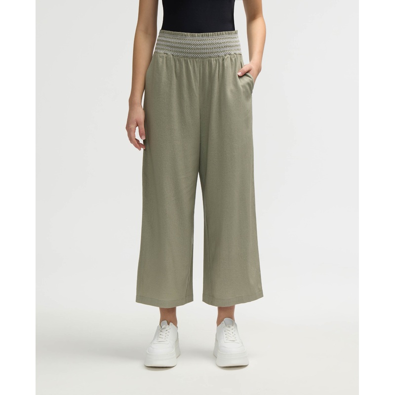 Refresh your warm weather wardrobe with these cropped pants. Featuring a contrast smocked elastic waistband, these pants offer a comfortable fit while the wide leg, cropped silhouette creates a breezy, modern look. Crafted from a lightweight linen blend, theyre perfect for sunny days and casual outings. ||| Contrast Smocked Elastic Waist ||| Slash Pockets ||| Wide Leg ||| Cropped ||| Inseam – 23.5Content – 75% Viscose, 25% Linen |||
