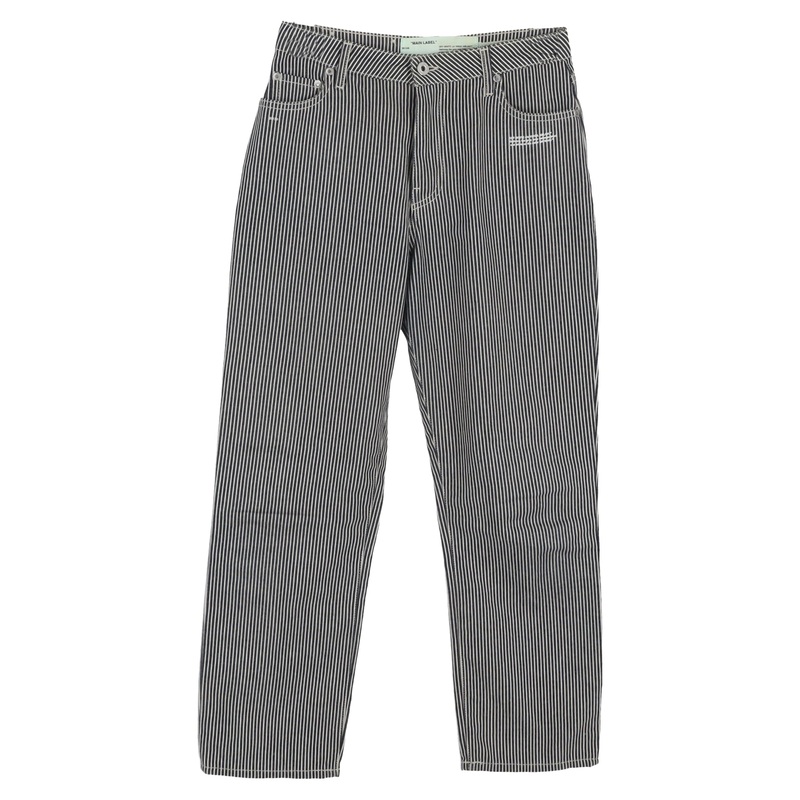 The Off-White Cropped Striped High Rise Straight Leg Jeans in light blue cotton from Virgil Ablohs Pre-Fall 2018 collection add a bold statement to any wardrobe. Featuring high-rise styling and bold vertical stripes, these jeans offer a fresh take on traditional denim. The cropped length and straight-leg silhouette give them a modern feel, while the zip and button closure make them as functional as they are fashionable. Perfect for creating standout looks that blend street style with high-fashion elements.Off-White Cropped Striped High Rise Straight Leg Jeans in Light Blue CottonCondition – ExcellentSigns of wear – No retail tag but Brand tag on., No visible sign of wear., Unused or used once, but as good as new.Packaging – NoneColor – Blue ||| blueMaterial – Cotton ||| cotton denimSize – US ||| 28Measurements – Inseam – 680; Outseam – 970; Waist – 350SKU – NAPPUGBCL464983W
