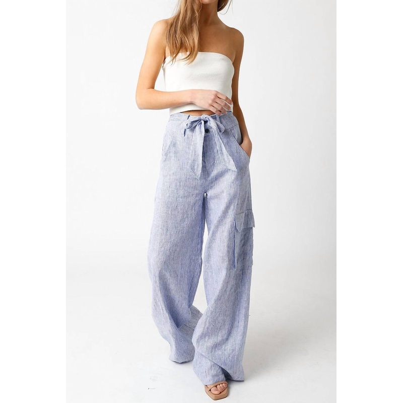 Introducing the Pamela Linen Pants by Olivaceous, a chic addition to any wardrobe. Crafted from 100% linen, these denim-colored wide-leg pants offer a comfortable fit and high-rise waist for a flattering silhouette. The stripe pattern and added pockets enh