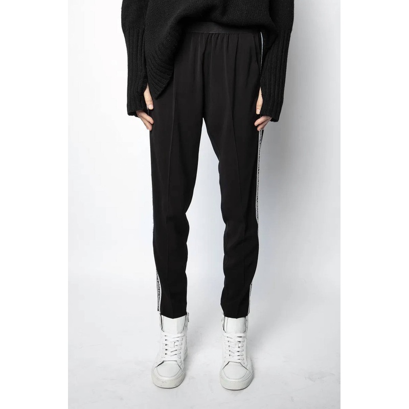 The perfect pant for running around town and looking cool while doing it.Introducing the Paula Band Logo Trim Pull On Pant by Zadig & Voltaire, perfect for stylish activewear. These women's black straight-cut trousers feature Zadig & Voltaire's signature c