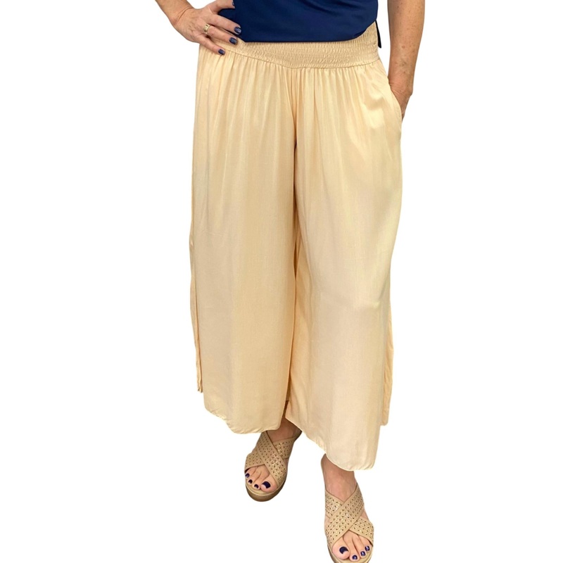 Discover the Peach Voyageur Pants by PINEAPPLE, expertly crafted for style and comfort. Featuring a relaxed fit and wide leg style, these pants are made from 100% Rayon. The light peach color with a solid pattern enhances feminine charm, making them perfect for travel or casual outings. Details include a smocked waistband, convenient side pockets, and a pull-on closure for easy wear.
