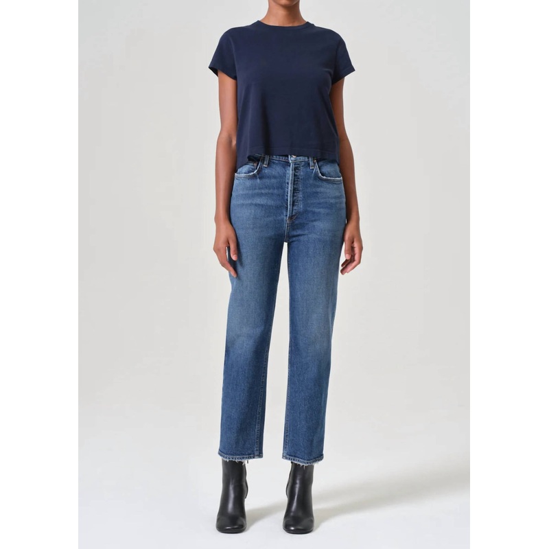 This straightleg pant is both stylish and comfortable. Did we mention the fit is perfection?Elevate your denim collection with the 90’s Pinch Waist Crop Jean by AGOLDE, crafted from a sustainable blend of 99% Regenerative Cotton and 1% Elastane in the shade Solace. Flaunting a high-rise waist and a close-fitting top block through the hips, these jeans feature a classic straight leg with a cropped inseam. Closure – Zip closure. Care – Machine wash cold inside out, tumble dry low.