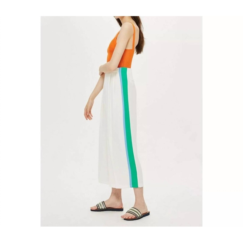 Pleated Crop Culottes Pants with Blue and Green Side StripesWide leg crop pant legBlue and green side stripesTwo pleats on each side of frontBack hidden zipper closureFaux slit back pockets100% PolyesterMachine washInseam 23.25"