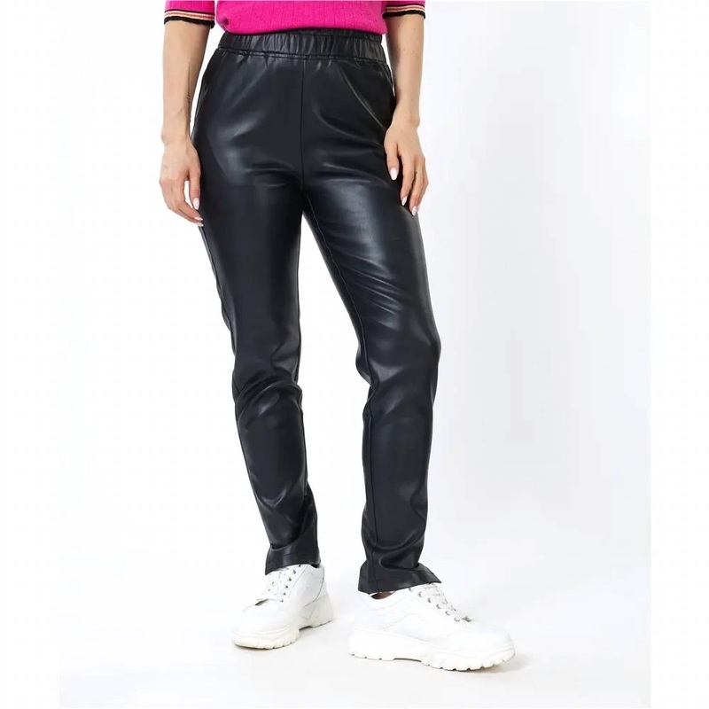 Introducing the Pleather Trouser by ESQUALO, a chic essential for your wardrobe in timeless black. These women's high-rise, relaxed-fit trousers feature a tapered leg design and are crafted from 60% Polyurethane and 40% Viscose for a stylish faux leather l