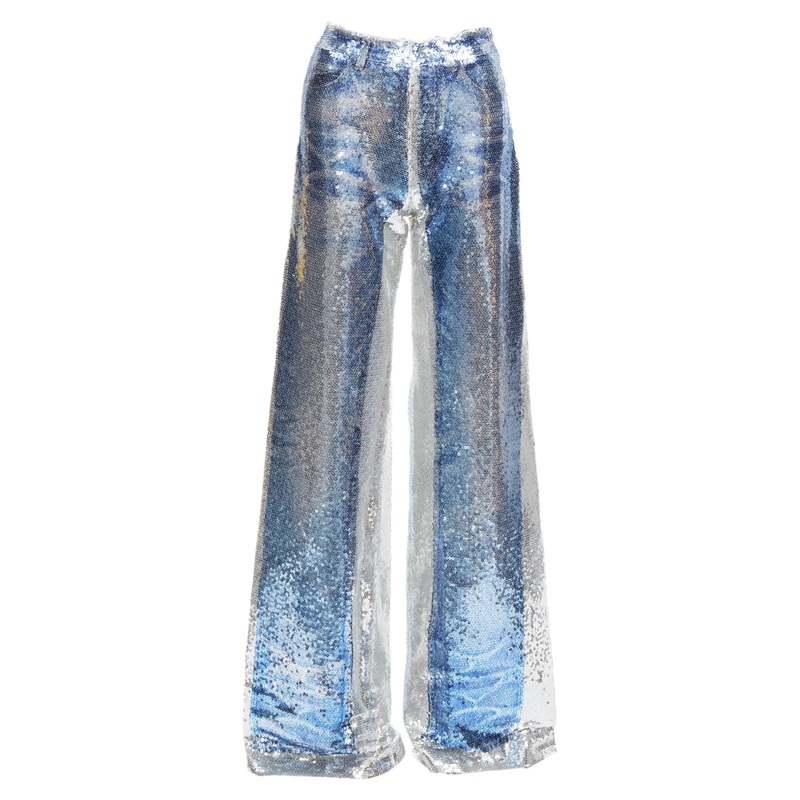 PONY STONE THAILAND silver blue tromp loeil jeans print sequins wide leg pants US2 SReference - BSHW/A00054Brand - Pony StoneMaterial - PolyesterColor - Blue, SilverPattern - SequinsClosure - Zip FlyLining - White FabricExtra Details - Side fly.Made in - L