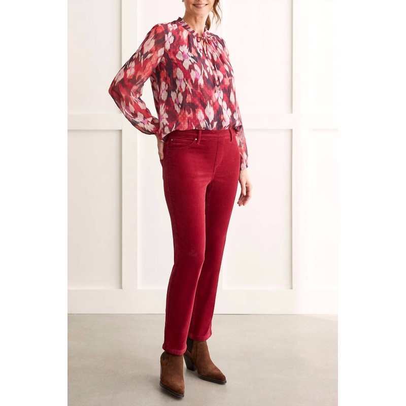 A perfectly tailored straight leg that you'll want in every color!Introducing the Pull On Cord Pants by TRIBAL, a stylish choice in vibrant Tibetan Red. These women's pants feature a textured pattern with a high-rise waist and a classic straight leg design