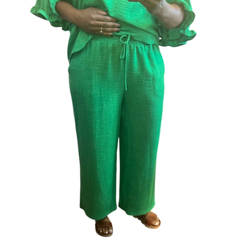 Introducing the Pull On Wide Leg Pants by LTX Sportswear, crafted for comfort and style in a rich green hue. These women’s pants feature an elastic waist with a faux tie and a high rise for a relaxed fit. The textured pattern and wide leg design offer a chic silhouette, complemented by practical pockets. Closure – Pull on.