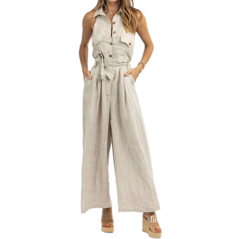 Discover the Revive Linen Pinstripe Jumpsuit by OLIVACEOUS, a stylish choice for the modern woman. Made from 100% Linen, this jumpsuit features a collared neckline and a button closure with a chic self-tie belt for a personalized fit. Enjoy the convenience