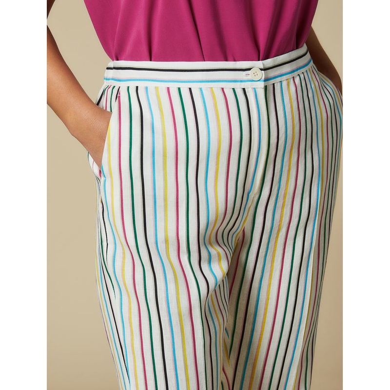 Pure linen canvas Capri trousers with an elasticated rear waistband, French pockets and pressed pleat detail. Fly-covered zip and button fastening.