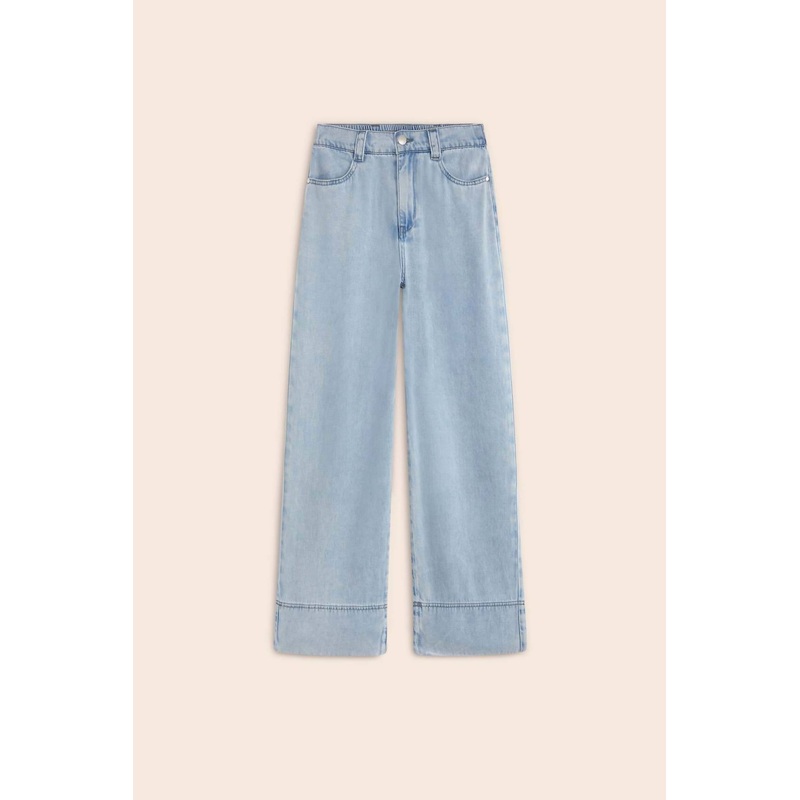 Elevate your wardrobe with the Romy Pants by Suncoo, featuring a relaxed fit and crafted from 100% Lyocell for ultimate comfort and style. These light denim wide-leg jeans in blue jean color come with a practical buttoned zipper closure, two side pockets,
