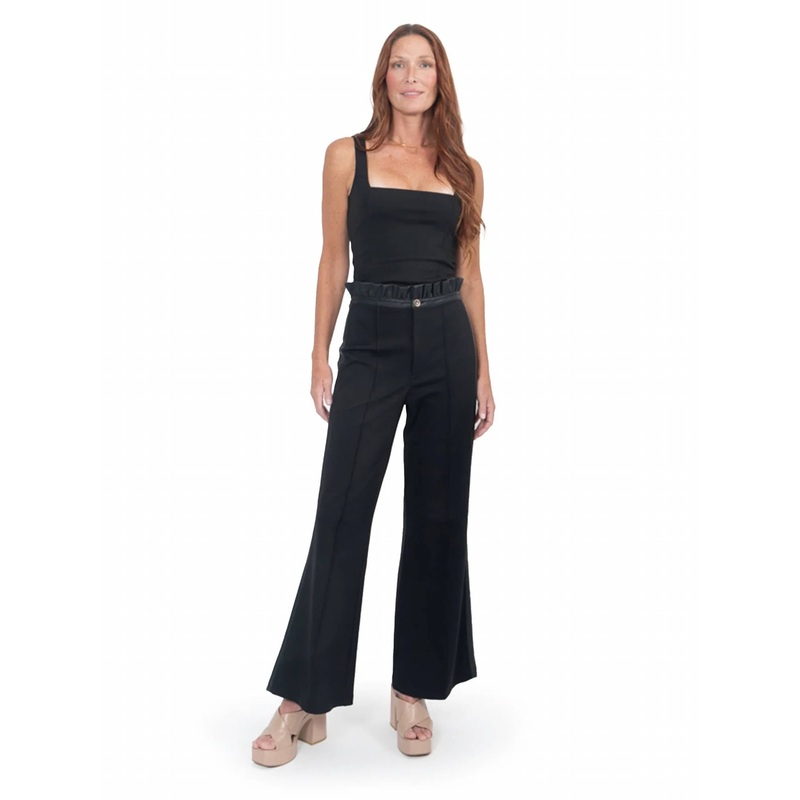 Slightly flared pants are all the rage right now and these are no exception. Pair these with your favorite tee for a more casual look, or with your favorite button-up blouse for an evening out.The Ruffle Flare in Black Ponte is our go to for all things comfy & chic, the perfect combination of sophisticated and casual. Featuring a sleek, fitted silhouette through the hip and thigh, these pants surprise with a playful flare at the hem. The leather ruffled waistband with gold hardware button closure and zipper detail elevates this everyday basic into a statement piece! Crafted in our best selling ponte fabric that provides comfortable softness and supportive stretch. Tuck in the Poppy Top in Black Ponte for an elevated everyday look!Details – High waistedVegan leather trimmed detailFlare legGold hardware button closure & zipPonteHand wash with gentle liquid or powder detergent. Cold water will help preserve color & shape. Hang dry.