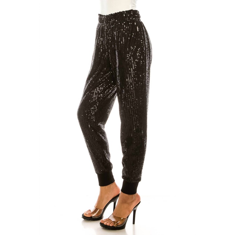 Pair these with your favorite sneakers for an effortlessly cool look.Elevate your loungewear with the Sequin Jogger by Wonderful & Young, a statement piece in shimmering black polyester. These women's track pants feature a comfortable fit with a tapered le