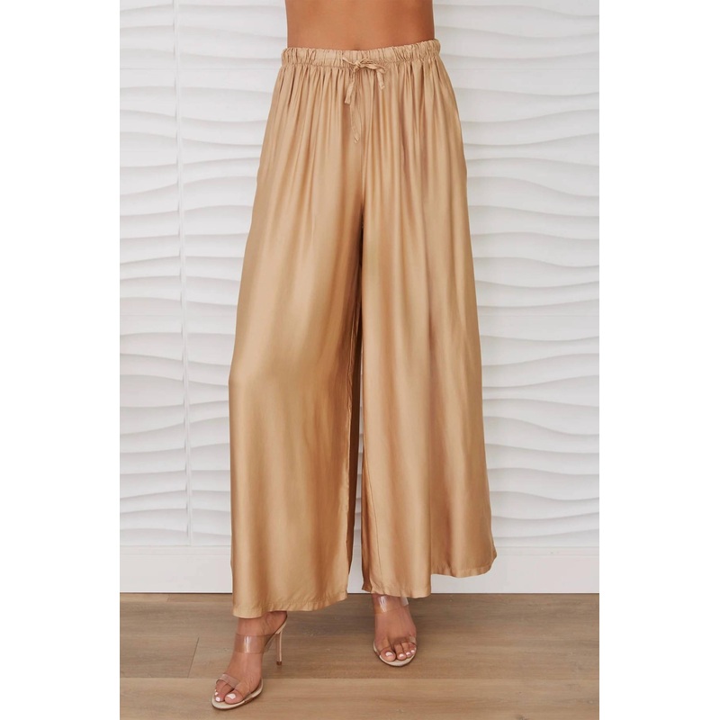 The trend report says boot-cut is in and that’s exactly why we love this style. They are fit to perfection, flattering on any body type, and comfortable. They will be your go-to all season long.Elevate your style with the Champagne Chic Wide-Leg Pants by Milio Milano, an embodiment of Italian elegance. Crafted from luxurious viscose and silk, these pants boast a high-rise, relaxed fit with a wide-leg silhouette that exudes a dramatic flair. They feature a convenient pull-on elastic drawstring waist and pockets, ensuring both comfort and practicality. Perfect for pairing with a cami or blazer, these solid-patterned pants offer a chic and sophisticated look.
