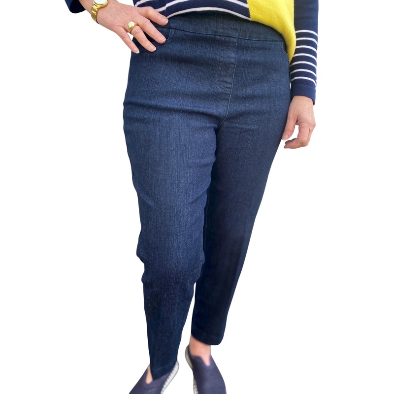 Enhance your wardrobe with this trendy cropped number, designed to blend style and practicality. The comfortable fit allows for easy all-day wear. The perfect length to pair with your favorite mules.Introducing the Slim Sation Denim Pants by Multiples, designed to keep you slim and stylish with ease. These straight-leg denim bottoms offer a high rise for a flattering fit and feature a convenient pull-on closure. Made in a timeless blue hue with a regular fit, they include pockets for added practicality. Care instructions – Machine wash and tumble dry for effortless maintenance.