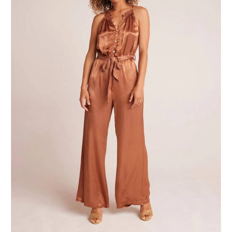 This smocked halter neck jumpsuit is a chic and stylish addition to your wardrobe. Made from luxurious satin fabric, it features intricate smocking detail on the neckline for a flattering and comfortable fit. The wide leg silhouette is on-trend, while the front pockets add functionality and convenience. 48% Rayon 26% Viscose 24% TencelLyocell 2% Linen.Made in Los Angeles48% Rayon 26% Viscose 24% TencelLyocell 2% LinenMachine wash coldSmocking detailButton front closureFront pocketsWide legDetachable tie belt