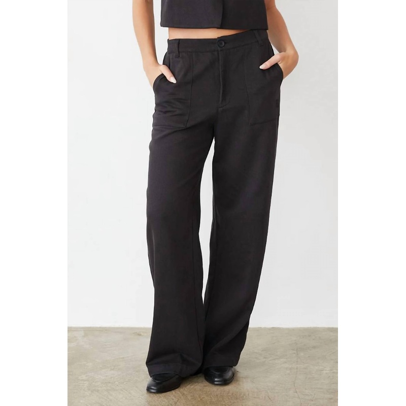 The Soft Twill Patch Pocket Pant by MONROW in washed black combines comfort with chic style. Crafted from a blend of 70% cotton and 30% rayon, this pant features a relaxed leg and tailored lines. It has front patch pockets, a sleek flat front, and single w