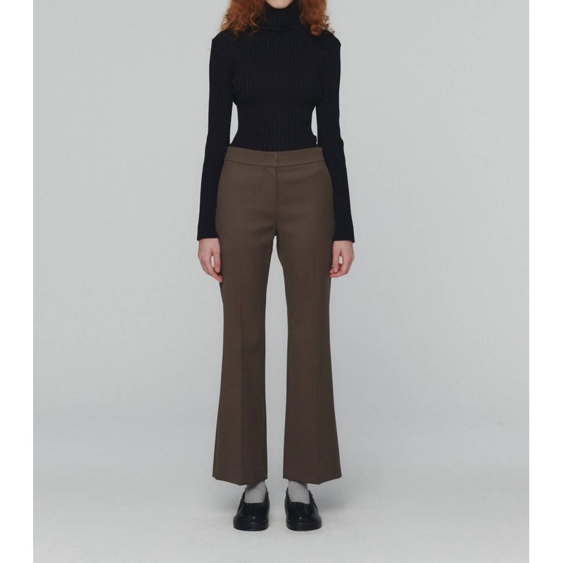 Designed for an effortless classic look. Wool blend pants in a solid brown have a slim fit. Featuring a straight leg with a slight kick flare at the hem. Crafted in Korea. Boast a high-rise waist and practical pockets, secured with a hook and eye closure. Composed of 49% Wool, 49% Polyester, 2% Lycra.