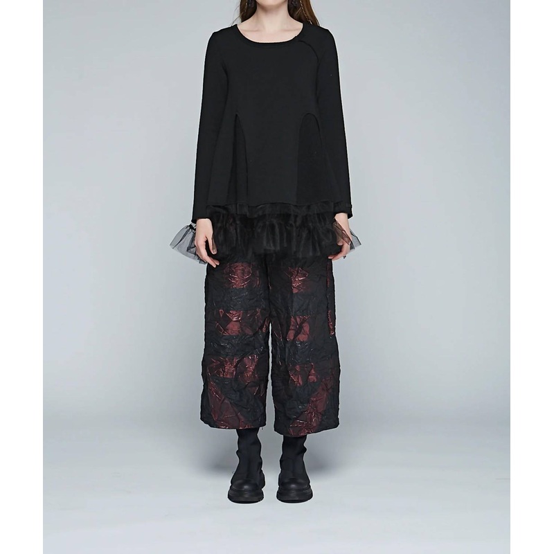 The Stripe Wrinkled Pant by Luukaa combines style with comfort, featuring a relaxed fit with a wide leg design. Made from 100% polyester, these ankle-length pants showcase a two-toned shiny burgdy and black stripe fabric, perfect for adding a funky touch t
