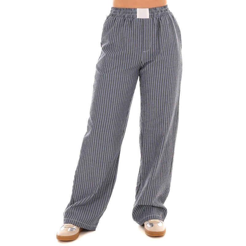These pajama-style pants are made from textured stripe fabric, featuring a baggy, wide-leg fit, high rise, four pockets, and an elastic waist with a pull-on design. Made from 100% cotton.