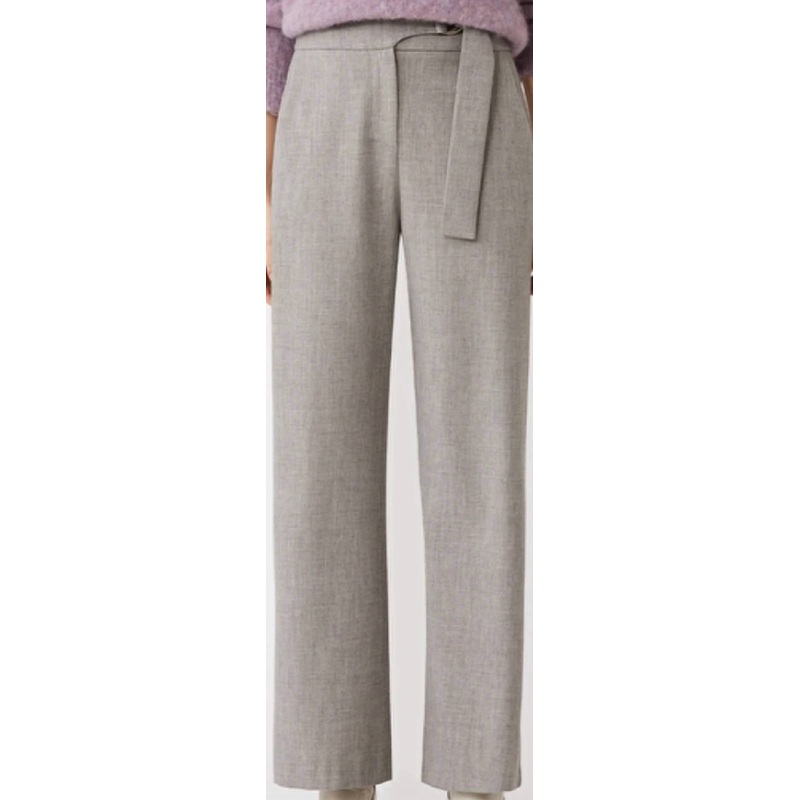 A grey wide leg pant with an adjustable belt.Fabric – 65% Polyester 35% Viscose