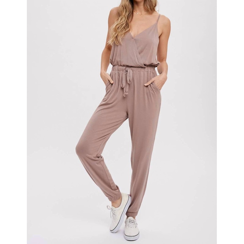 Introducing the Surplice Casual Jersey Jumpsuit by BluIvy, a chic and comfortable addition in classic navy for your wardrobe. It features a surplice neckline and a pull-on closure with a relaxed fit, elastic waist, and a tie strap. Crafted from soft rayon