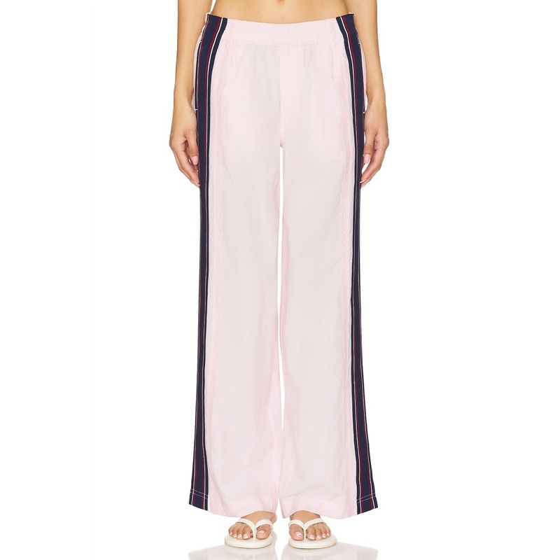 Get the perfect balance of sporty and chic with the Team Spirit Pull-on Pants by Free People, in a vibrant Pep Pink color. These wide-leg, mid-rise pants feature a comfortable pull-on design with embroidered lace striping and sporty striped detailing at the sides. Crafted from 100% cotton with polyester trim, they’re as versatile as they are stylish, boasting side pockets for convenience. Dimensions for size small include a 30.5-inch waist, 40.5-inch hips, 11.25-inch rise, and 29.75-inch inseam. Care – Hand wash cold.
