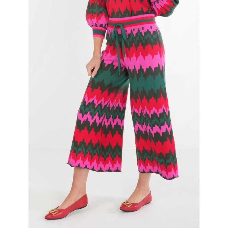 Introducing the Teddy Crop Trouser by Emily McCarthy, delivering both comfort and elegance in a bold Ruby Ripple pattern. These high-rise pants feature a cozy viscose blend composition and a modern wide-leg fit with a flattering drawstring waistband. Closu